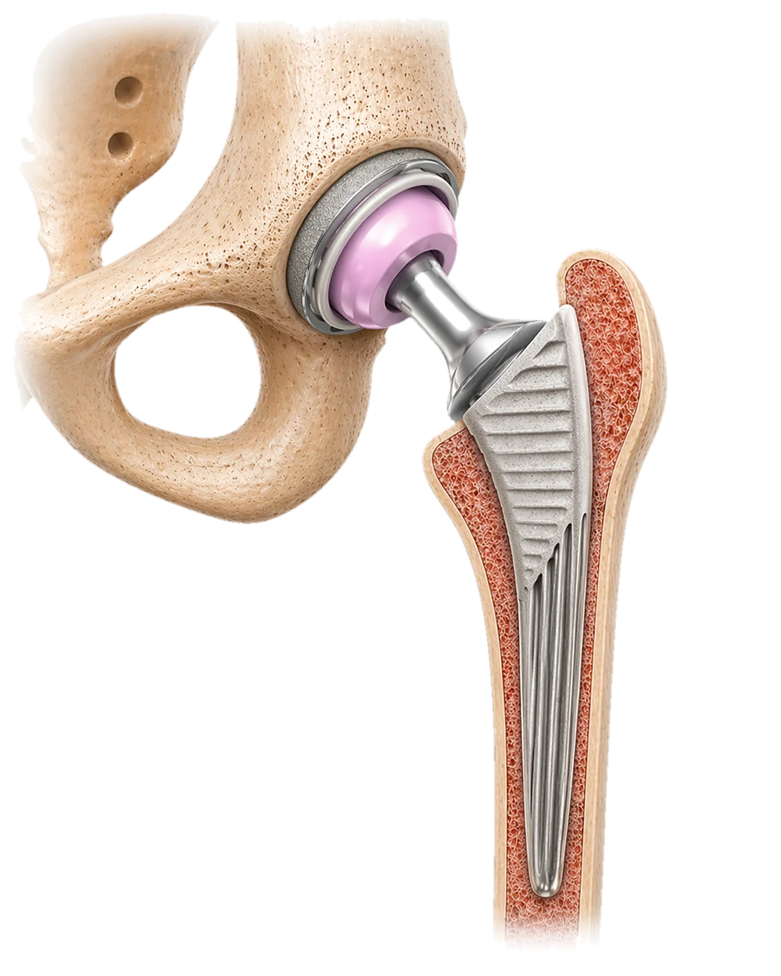 The worn femoral head is removed and replaced with a ceramic or metal ball on a titanium stem. The acetabular socket is resurfaced with a precisely-oriented cup and bearing liner.